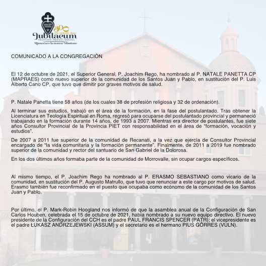 Nuevo superior de la comunidad de los Santos Juan y Pablo