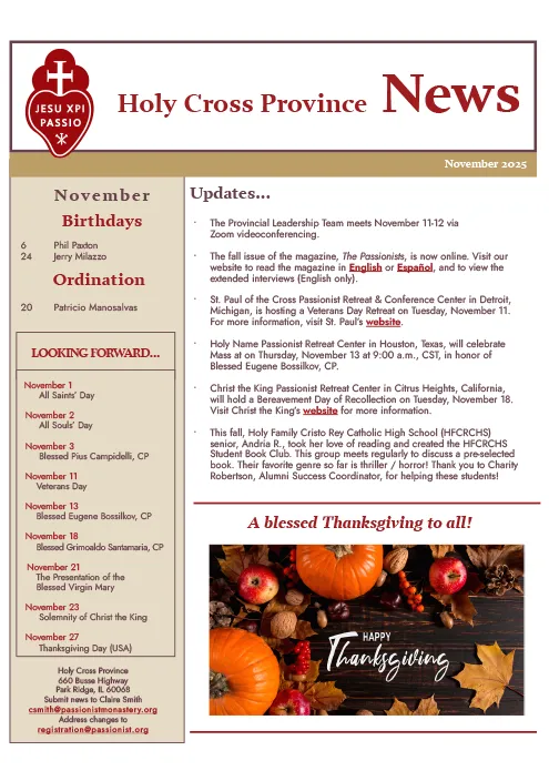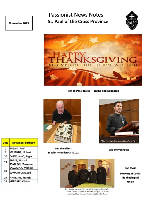 THE PASSIONISTS – HOLY SPIRIT PROVINCE November 2025 Galleria THE PASSIONISTS – HOLY SPIRIT PROVINCE November 2025 Pubblicazioni THE PASSIONISTS – HOLY SPIRIT PROVINCE November 2025 Di A.M.|2025-12-03T09:43:41+01:00Dicembre 3rd, 2025|Pubblicazioni|0 Commenti Continua a leggere