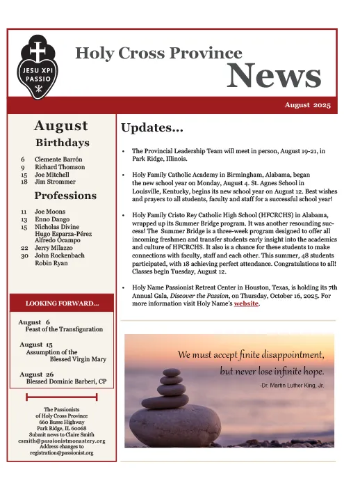 THE PASSIONISTS OF HOLY SPIRIT PROVINCE June 2025 Galleria THE PASSIONISTS OF HOLY SPIRIT PROVINCE June 2025 Pubblicazioni THE PASSIONISTS OF HOLY SPIRIT PROVINCE June 2025 Di A.M.|2025-07-01T12:17:33+02:00Luglio 1st, 2025|Pubblicazioni|0 Commenti Continua a leggere