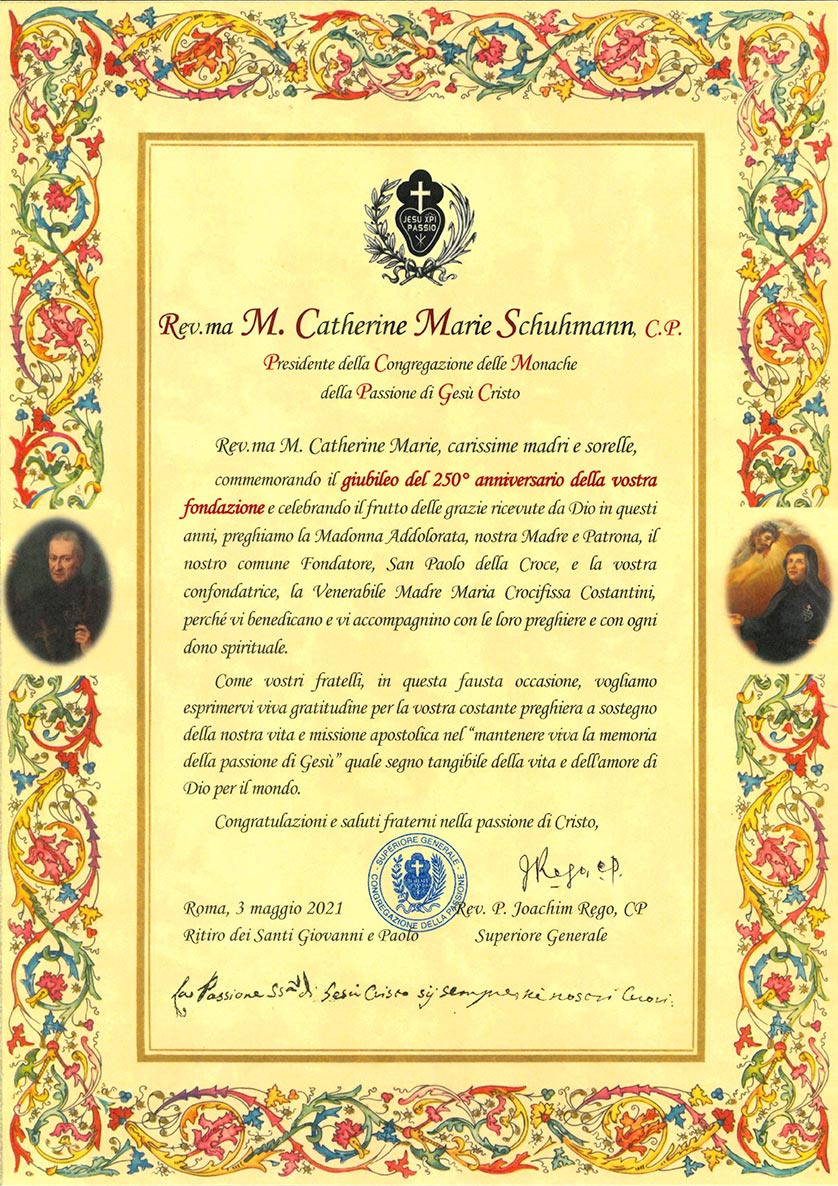 View Larger Image Letter to the Congregation of the Passionist Nuns on the occasion of the 250th anniversari of foundation The letter is available in the following languages: By A.M.|2021-05-03T15:54:32+02:00May 3rd, 2021|News|0 Comments Share This Story, Choose Your Platform!